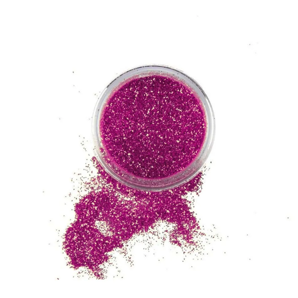 Descrizione Glitter fucsia in vasetto trasparente con coperchio.