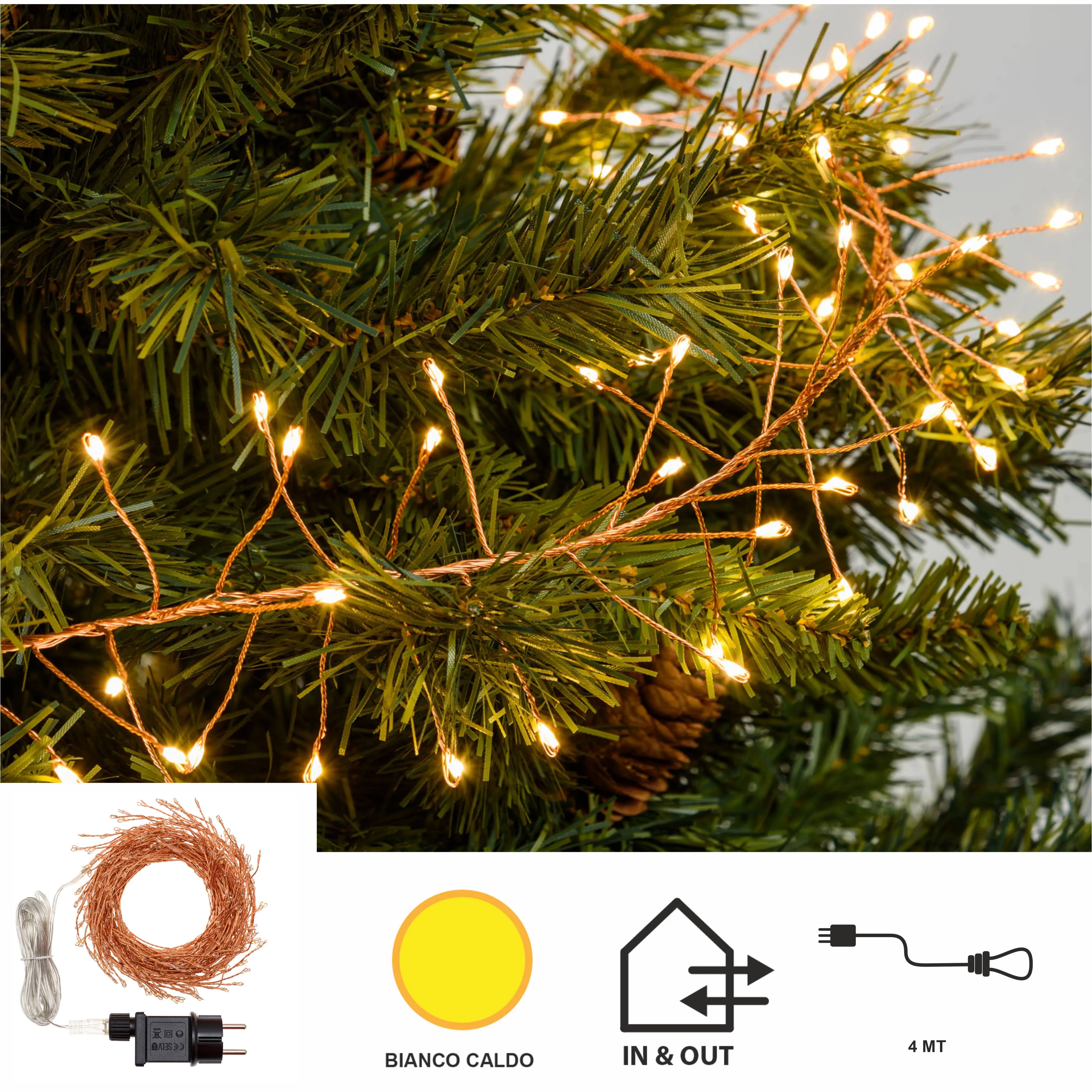 Descrizione Festone Cluster, catena lineare d.10cm, cavo metallico rame d.1,5mm e luce fissa. Bianco Caldo. Per uso interno - esterno.