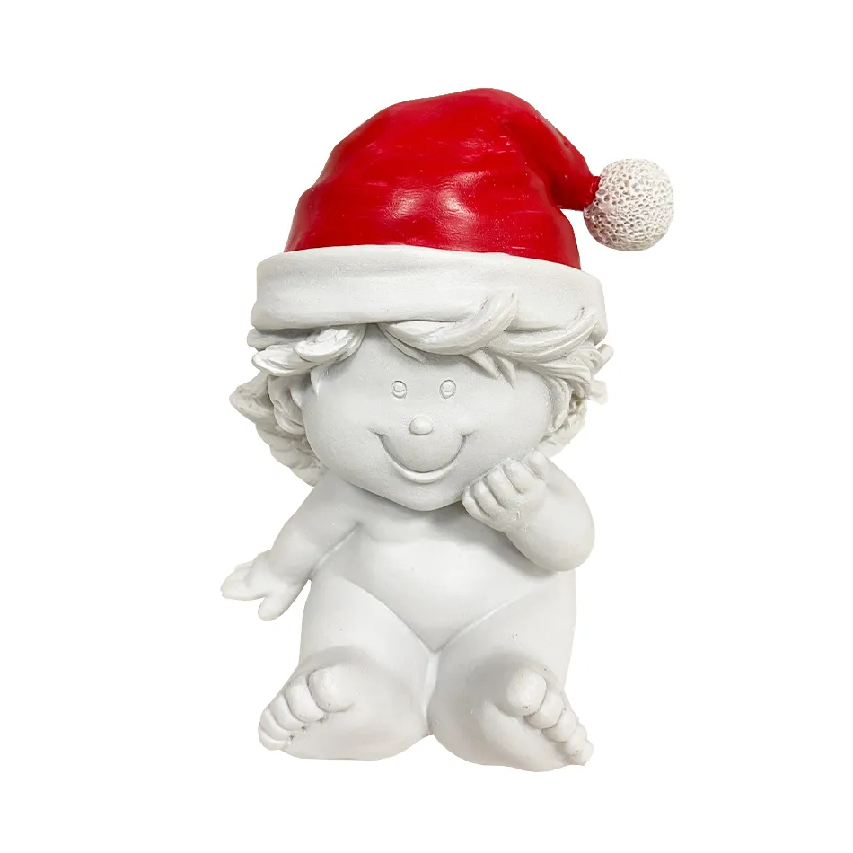 Angelo di Natale Seduto, in vetroresina bianca e cappello natalizio rosso