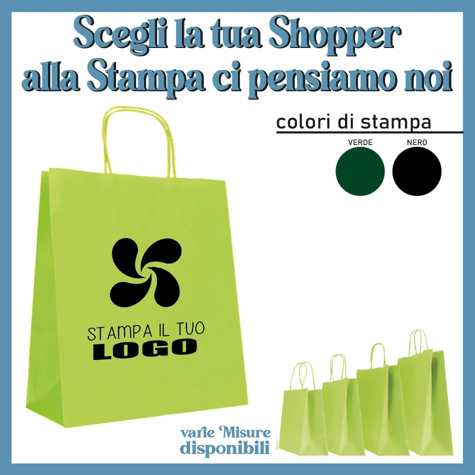 Caratteristiche shopper: carta Kraft verde mela con manico in cordino di carta colorato e interno bianco, prodotta con carta riciclabile,composta di materie di alta qualità e resistenza. La grammatura varia dai 90 gr ai 110 gr in base alla misura della borsa shopper.