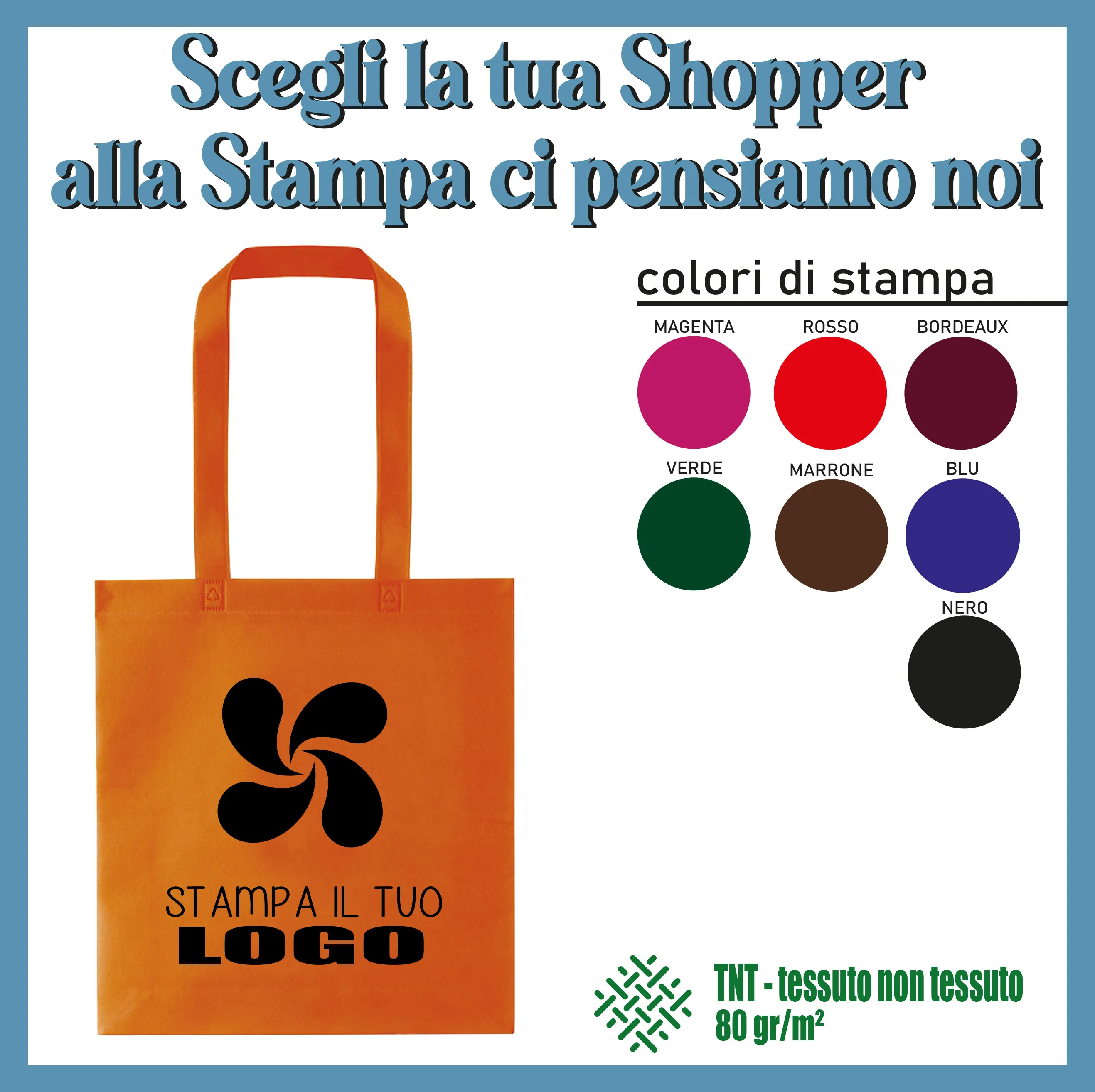 Caratteristiche shopper: tessuto non tessuto TNT 80 gr/m², colore Arancione, prodotto termosaldato (senza cuciture) dotato di manici lunghi che ne facilitano il trasporto, resistente e riutilizzabile, ideale come gadget o per il negozio.