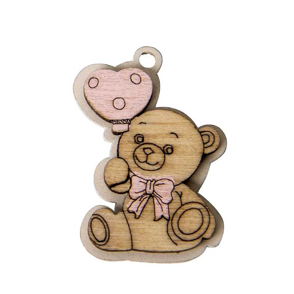 Pendaglio in legno naturale a forma di Orsetto con fiocco e palloncino Rosa, con foro per legare il pendaglio con un nastro alle confezioni regalo e bomboniere.