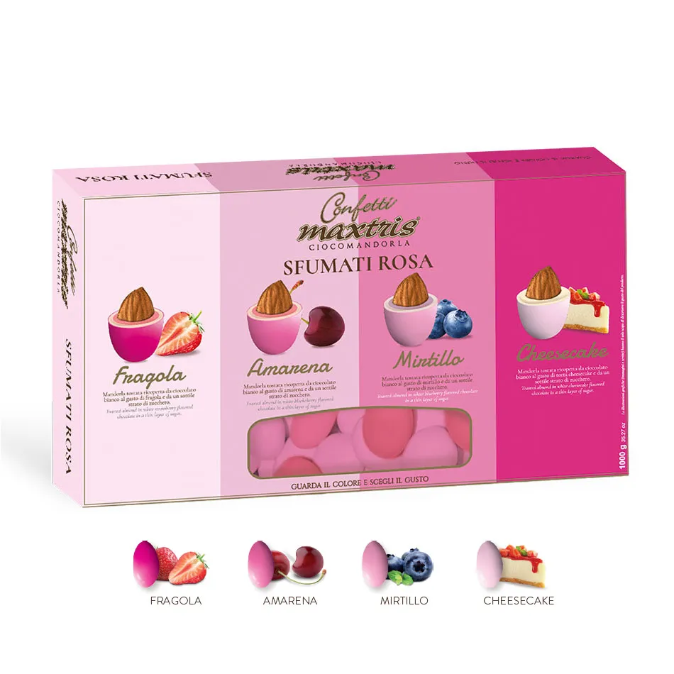 Confetti Maxtris Cioccomandorla Sfumati Rosa, confetti con mandorla tostata ricoperta di cioccolato bianco ai gusti assortiti e da un sottile strato di zucchero. I gusti assortriti sono: fragola, amarena, mirtillo, cheescake. Senza glutine. Confezione Kg 1