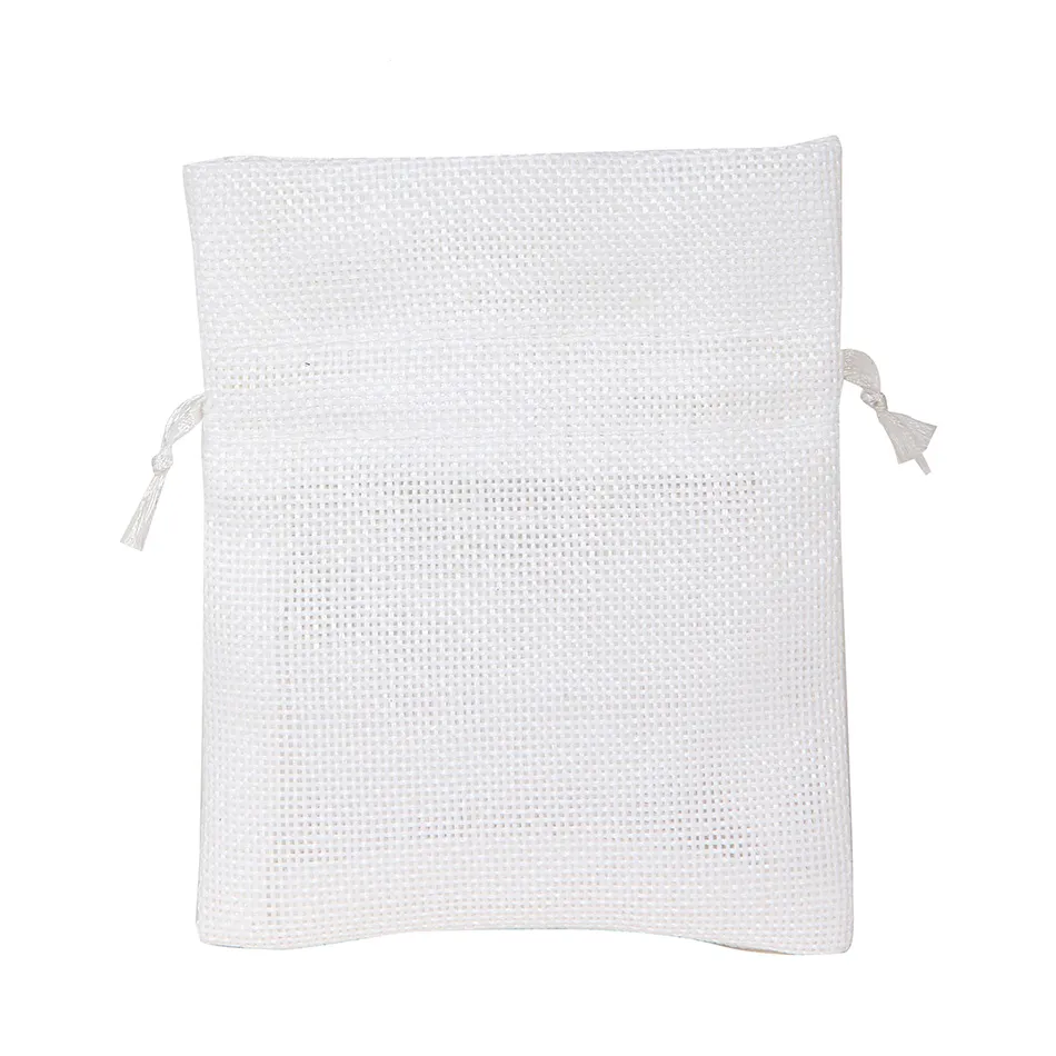 Sacchettini in Tela yuta bianco, in tinta unita con laccio per la chiusura in tono, per il confezionamento di bomboniere, articoli di piccole dimensioni.