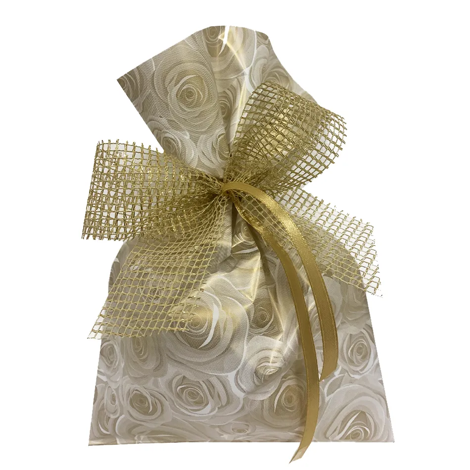 Buste Regalo in PPL polipropilene Bianco con Rose Oro Tenue. Ideali per il confezionamento di articoli regalo , abbigliamento e oggettistica.