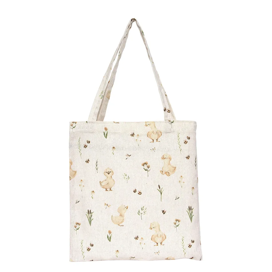 Descrizione Borsa in tessuto con manico lungo. Fondo colore panna con fiori e paperelle.