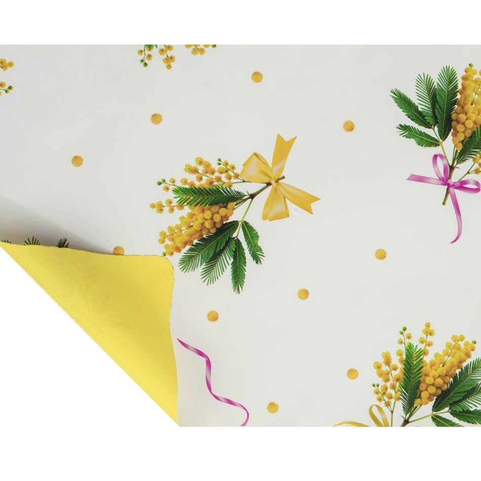 Bobina carta in polipropilene con mimosa e fondo giallo. Da un lato tinta unita e l'altro fantasia.