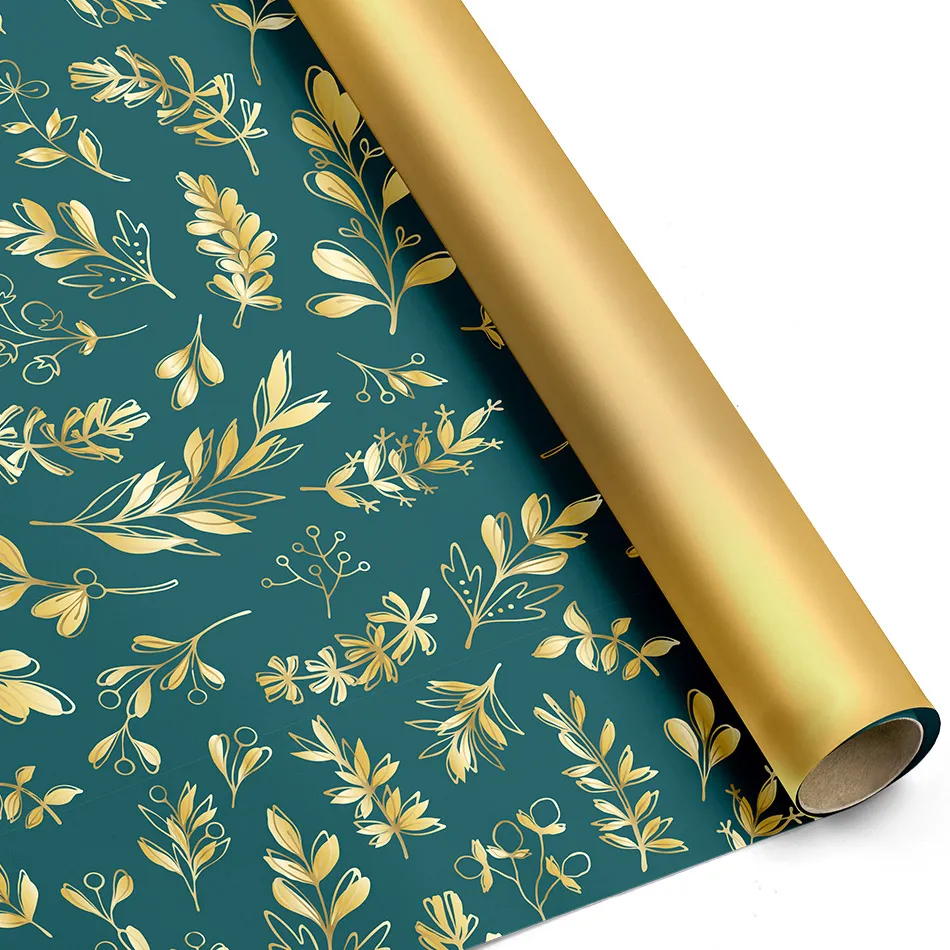 Descrizione Bobina Carta Regalo in Polipropilene Ottanio e Rami di Bacche Dorati, retro Oro