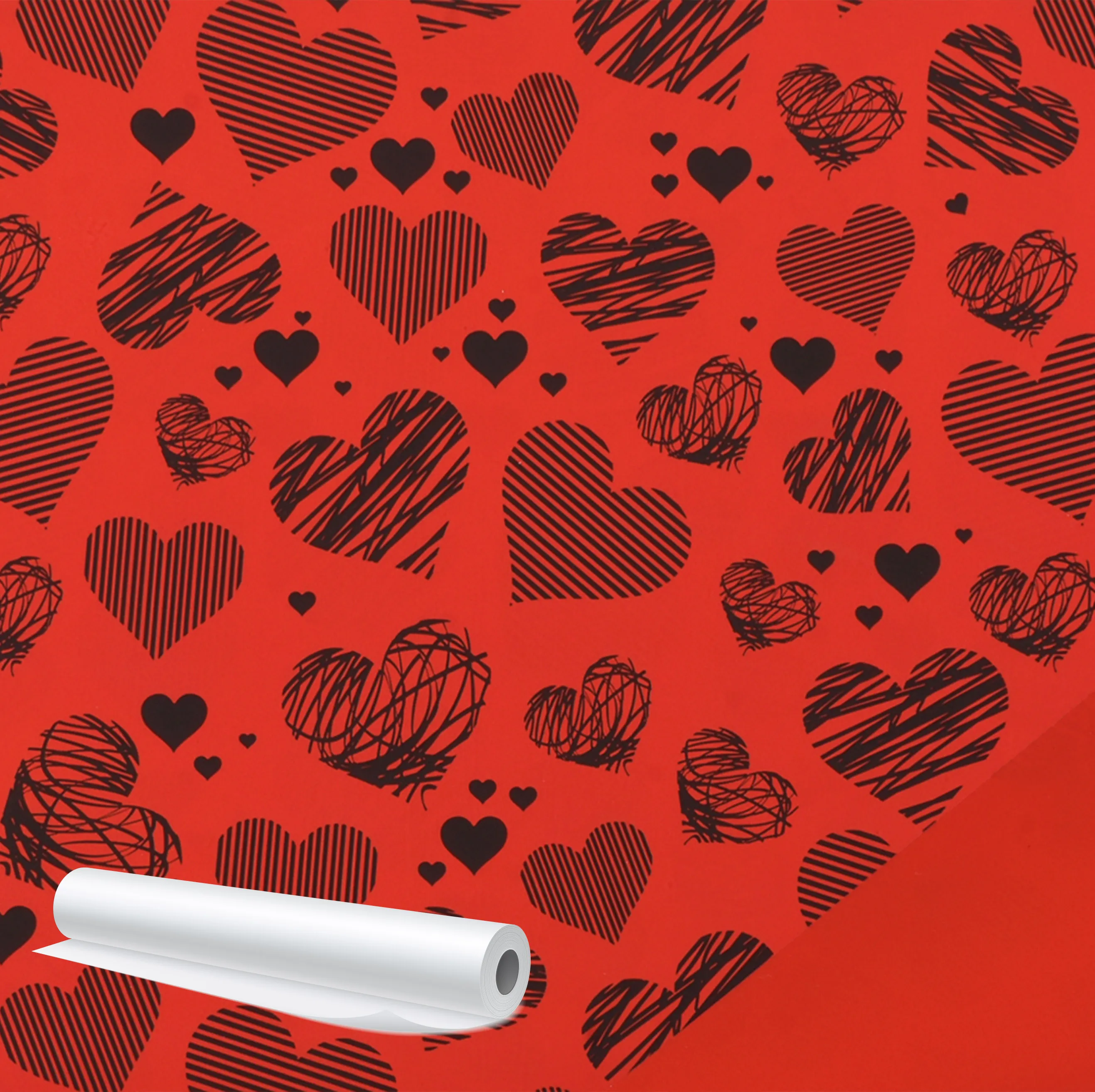 Bobina Carta Regalo in Polipropilene Rosso cuori Neri, retro in tinta unita Rosso