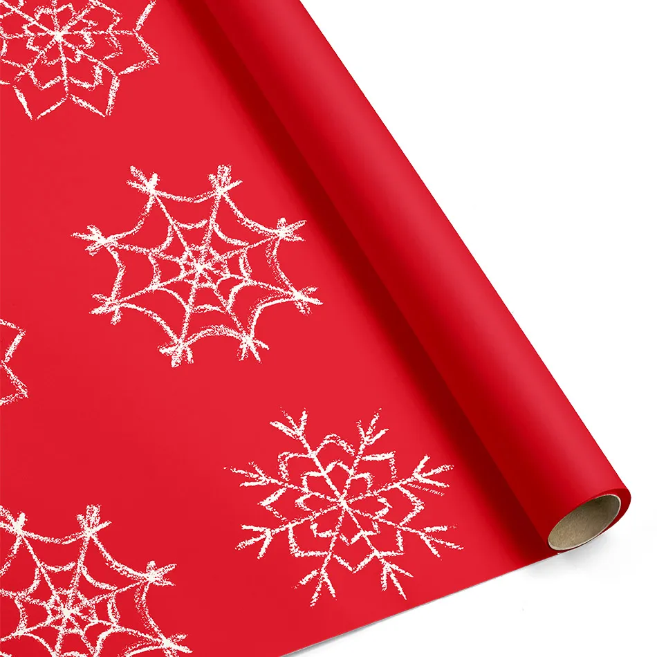 Descrizione Bobina Carta Regalo in Polipropilene Rosso e Fiocchi di Neve Bianchi