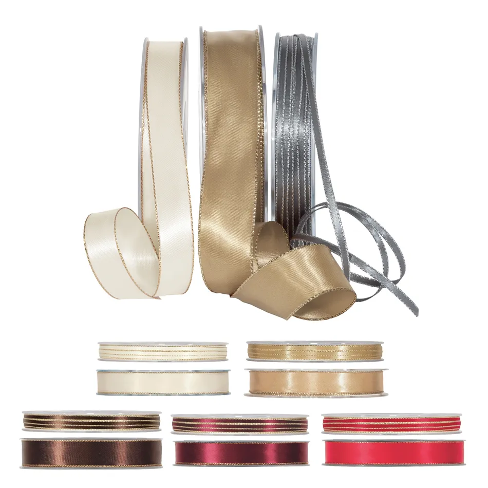 Descrizione Nastro in raso con bordino in lurex oro, ideale per completare e raffinare il decoro o la confezione regalo.