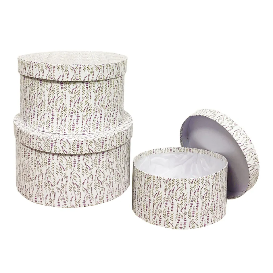Descrizione Set 3 Capelliere Lavanda, scatole in cartone con rivestimento interno in plastica.