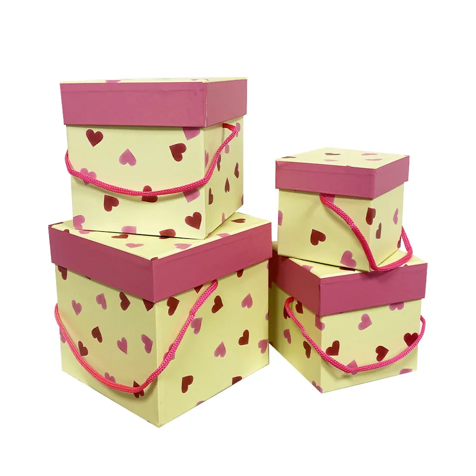 Descrizione Set 4 scatole in cartone Avorio co stampa di cuoricini rossi e rosa e fascia sul coperchio Rosa, con maniglia in cordoncino rosa.
