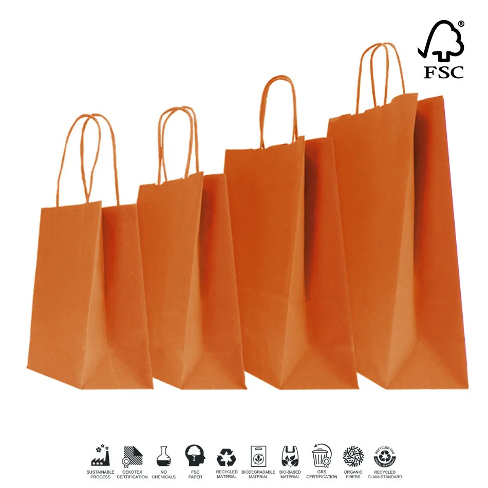 Descrizione Shopper Borsa Carta Kraft arancione con manico in cordino di carta colorato e interno bianco .