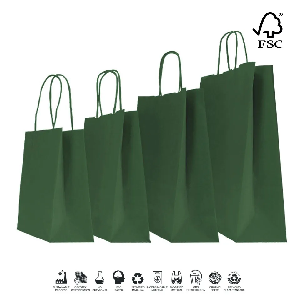 Descrizione Shopper Borsa Carta Kraft verde scuro con manico in cordino di carta colorato e interno bianco .