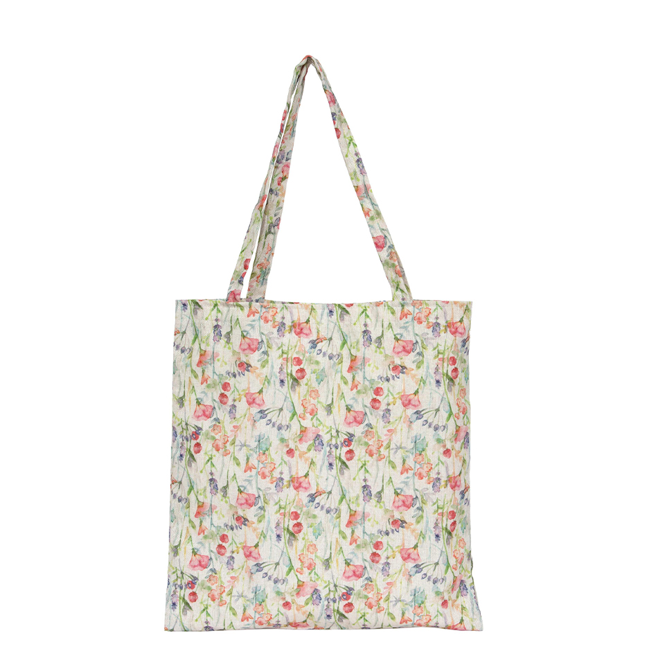 Descrizione Borsa in tessuto con manico lungo. Fondo colore panna con fiori.